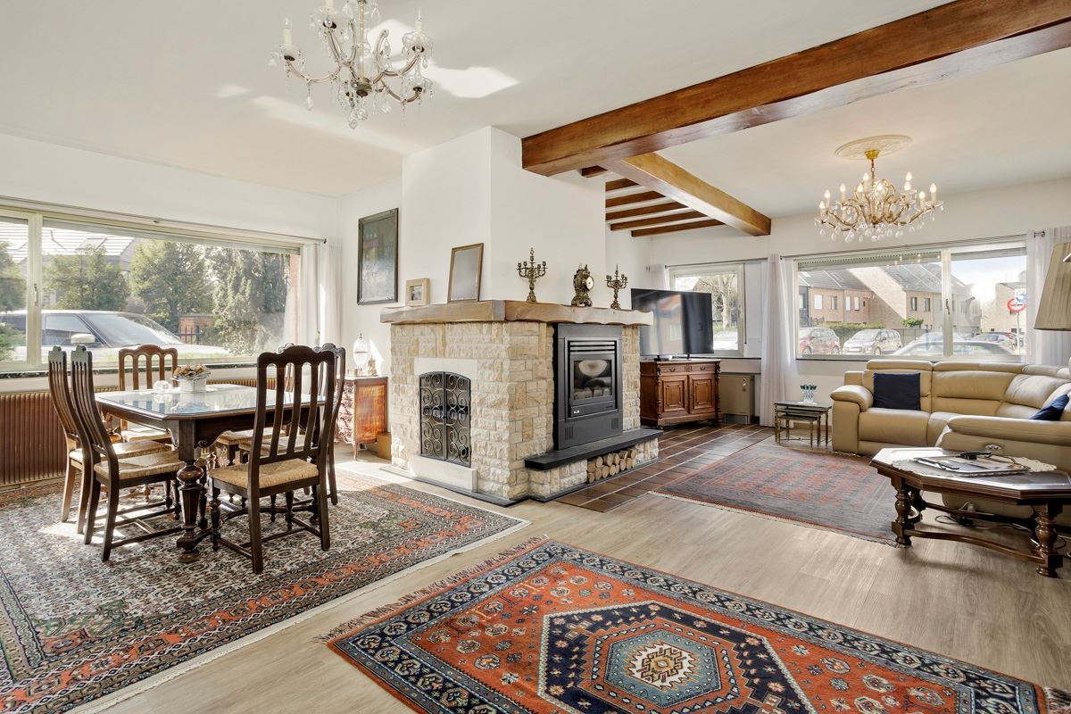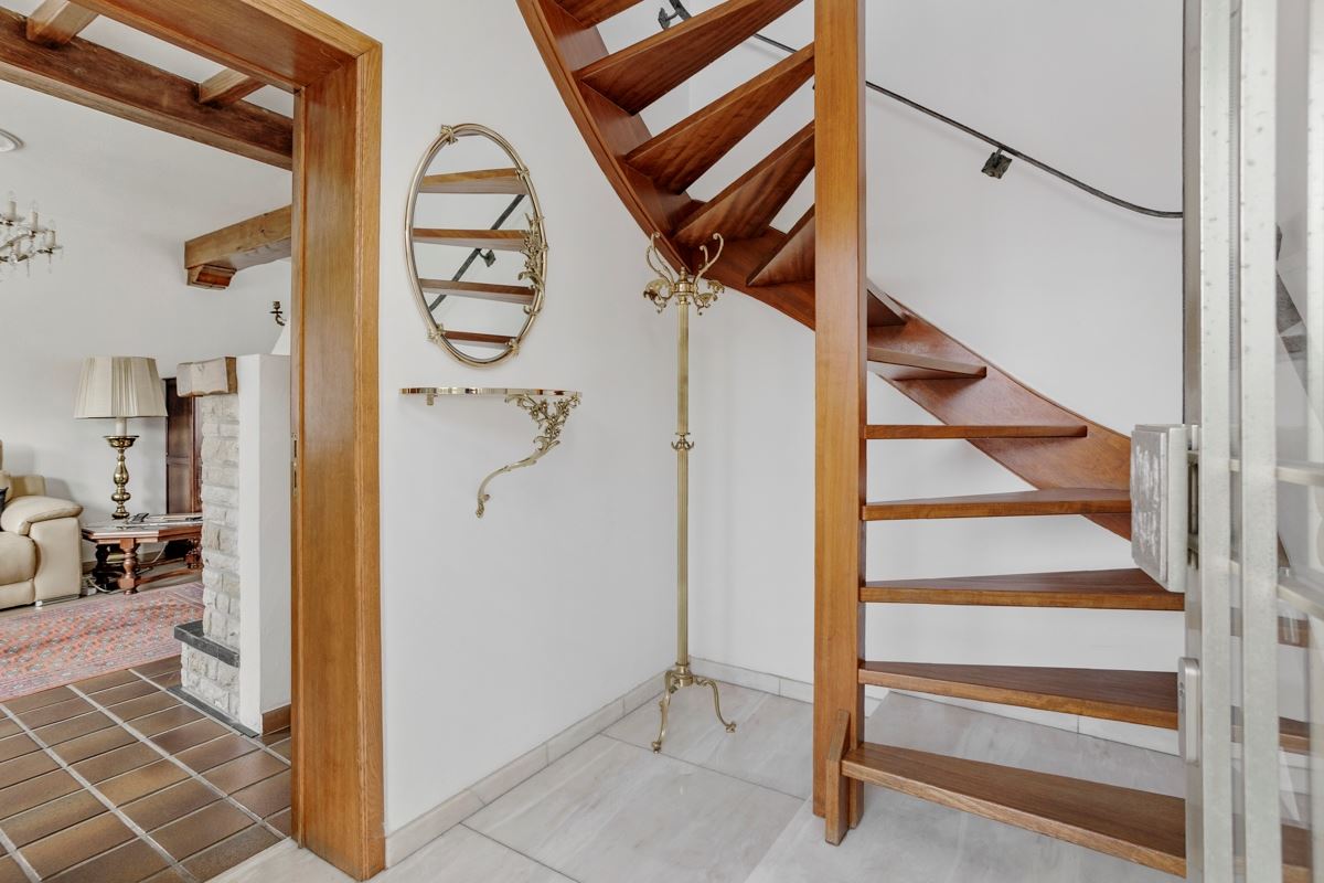 Inkomhal, riante en zeer lichte living (40 m²) met recente pelletkachel perfect geschikt voor het verwarmen van de volledige benedenruimte.