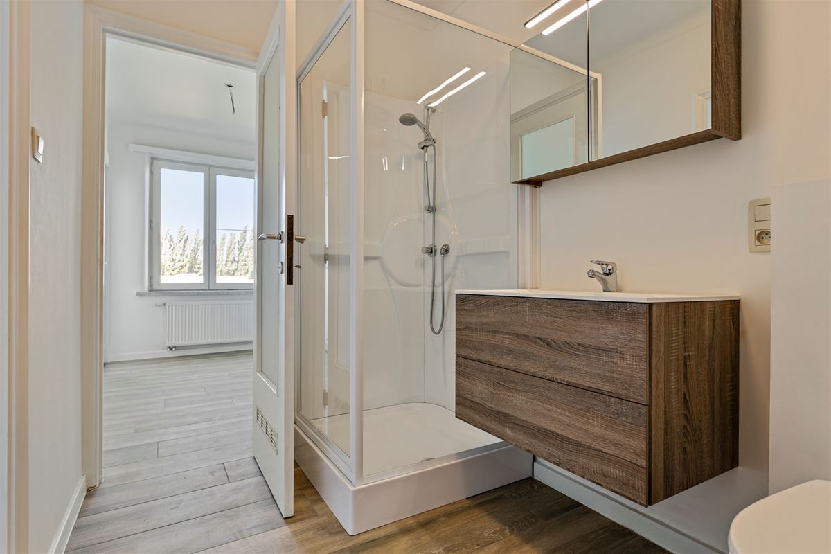 Tijdloze, nieuw ingerichte badkamer met een douche, handoekdroger, enkele wastafel met spiegel en verlichting + aansluiting voor een wasmachine.