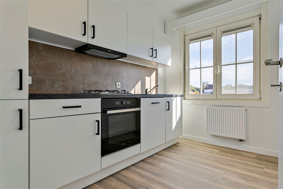 De zonnige woon,-en leefruimte baadt in het licht en beschikt over een aparte spiksplinternieuwe keuken, ingericht met inbouwtoestellen: oven, 4-pit op gas, vaatwasser, ijskast met diepvriesvak en dampkap.