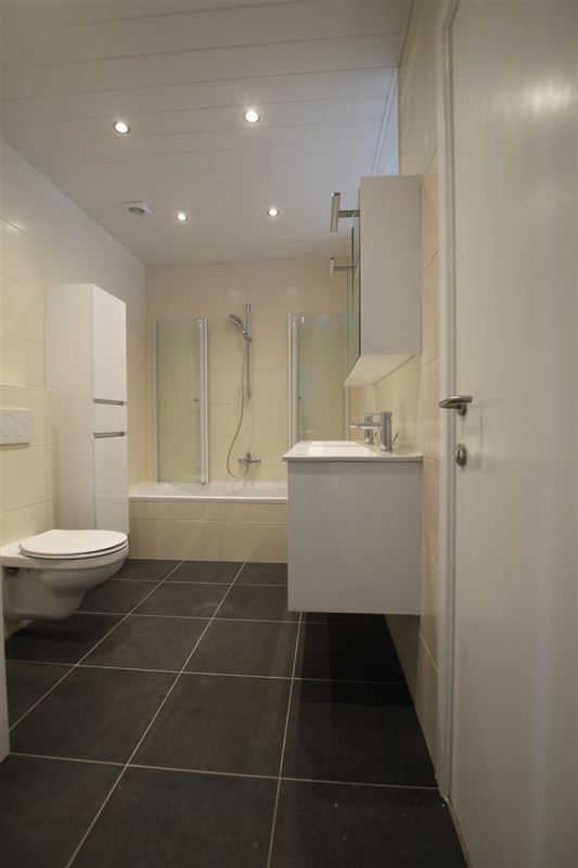 Badkamer : 8m² voorzien van bad met ingebouwde douchecabine - toilet - sierradiator - dubbele wastafel in meubel met verlichting.