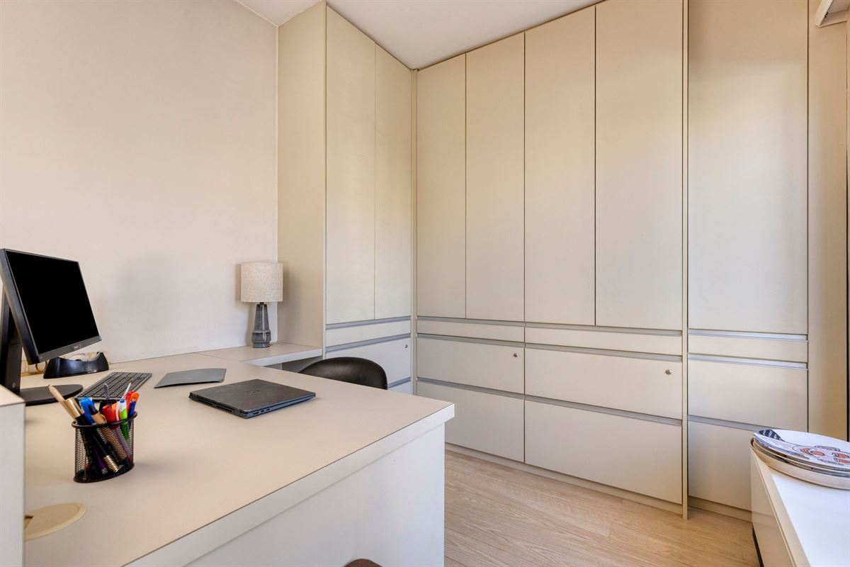 De eerste verdieping vormt het hart van de woning, met een lichtrijke woon- en leefruimte die naadloos aansluit op een aangenaam terras. De halfopen keuken en het geïntegreerde bureaugedeelte zorgen voor een hedendaagse en praktische invulling van de ruimte.