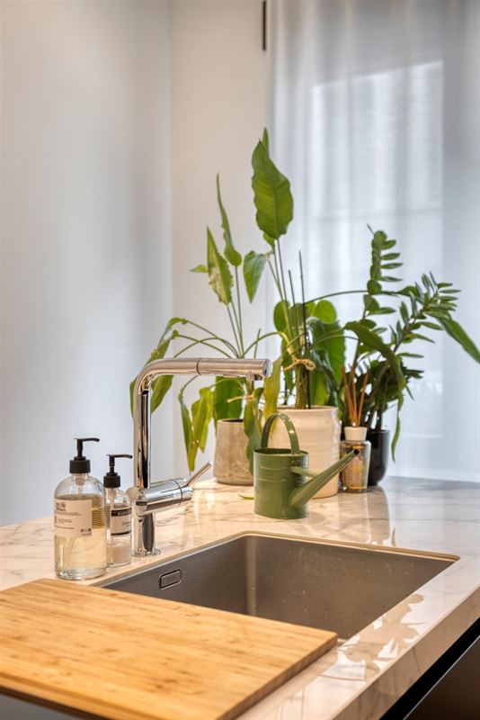 dampkap, oven en wijnkoeler. De marmeren accenten in combinatie met het elegante