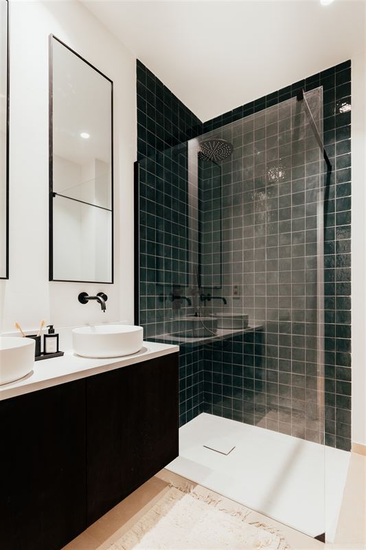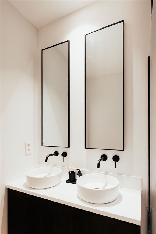 De designbadkamer straalt klasse uit met een brede inloopdouche, dubbele op maat gemaakte wastafels en stijlvolle spiegels.