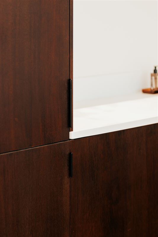 De luxueuze keuken is uitgerust met een elegant kookeiland met bar, een ingebouwde kookplaat met geïntegreerde dampkap, een royale kastenwand met alle nodige toestellen én zeeën van opbergruimte.